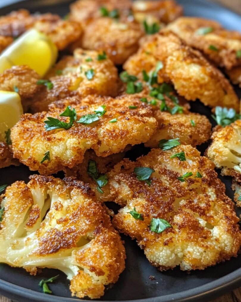 Zuerst den Blumenkohl in dicke Scheiben schneiden. Achte darauf, dass die „Schnitzel“ ungefähr gleich dick sind, damit sie gleichmäßig garen. Entferne die äußeren Blätter und den Strunk des Blumenkohls, aber behalte den inneren Teil, der die Schnitzel bildet.