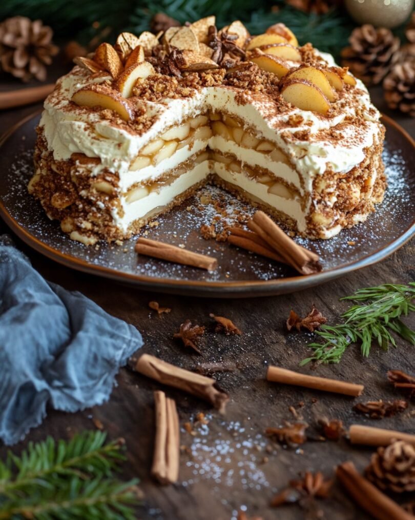 • Die Mascarpone-Creme großzügig auf die Äpfel geben und mit einem Löffel zu einer Kuppel formen, sodass der typische „Maulwurfshügel“-Effekt entsteht.