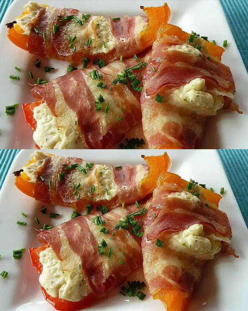 Diese kleinen Schiffchen sind einfach himmlisch: saftige Paprikaviertel gefüllt mit cremigem Frischkäse, aromatischem Knoblauch und Crème fraîche, umhüllt von knusprigem Bacon. Perfekt als Snack, Vorspeise oder Partyleckerbissen, die auf jedem Tisch sofort verschwinden!